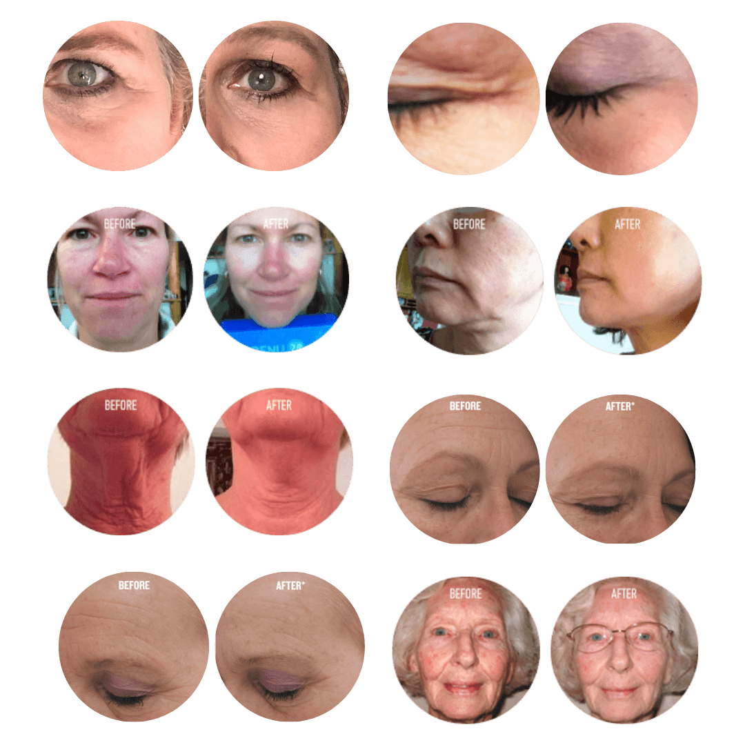 Have a look at these impressive before & after photos of multiple women of several age groups over a 30-day period, including my own. The first row is my personal transformation when I first started out with the Redox Molecules supplement & topical application in 2019.